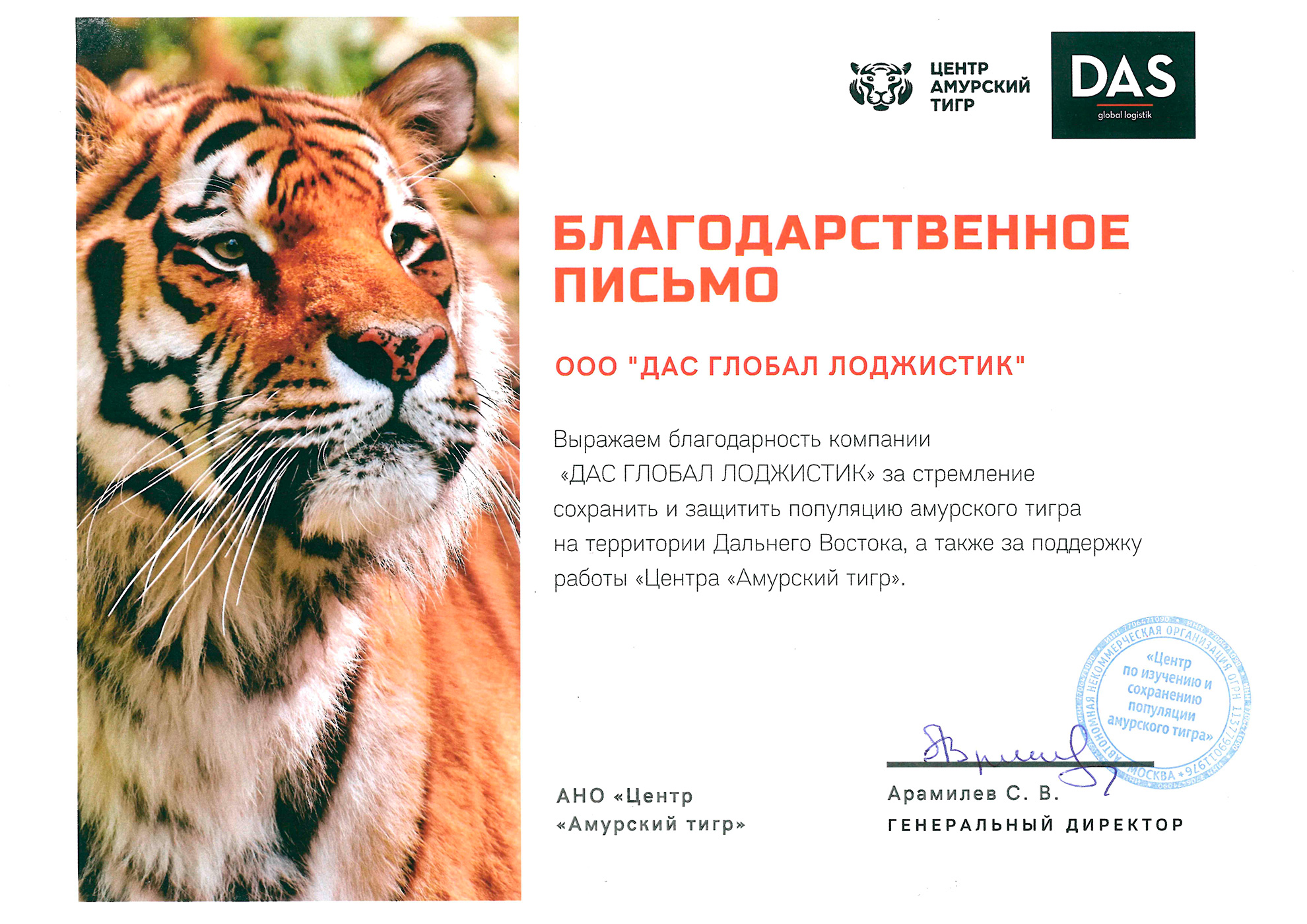 Благодарственное письмо / Центр «Амурский тигр»